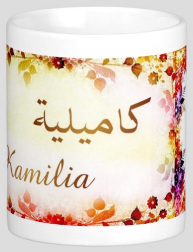 Mug avec le prénom "Kamilia" écrit en français, en arabe (كاميلية) et calligraphié de façon artistique en arabe sur la partie droite.