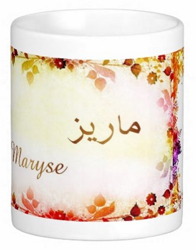 Mug avec le prénom "Maryse" écrit en français, en arabe (ماريز) et calligraphié de façon artistique en arabe sur la partie droite.