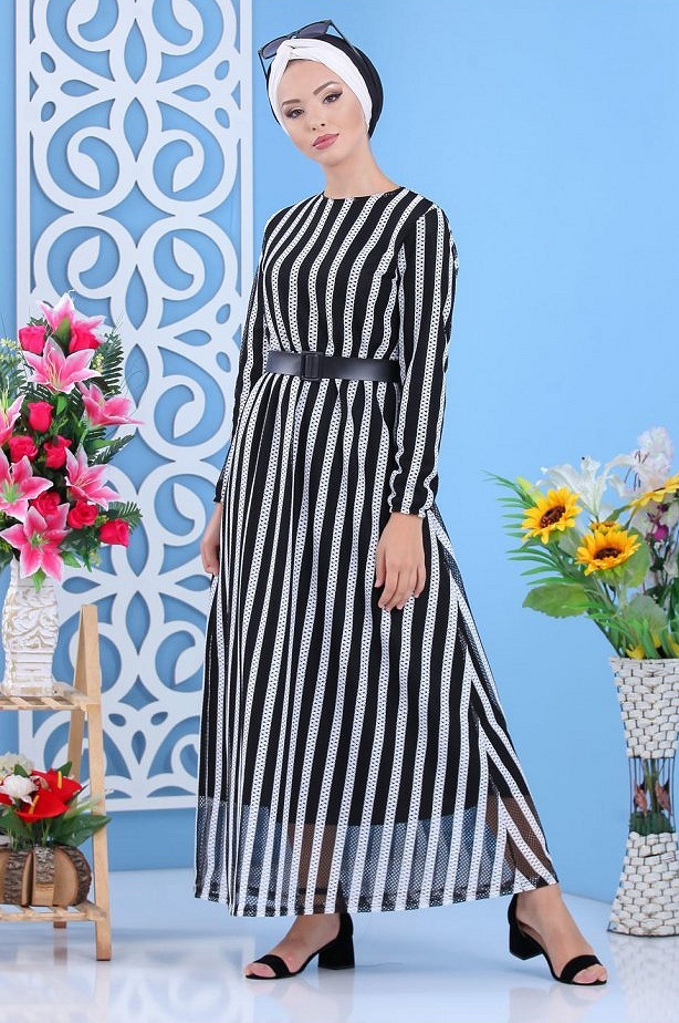 Robe longue à rayures avec ceinture pour femme - Couleur blanche et noire Vetement & Accessoire
