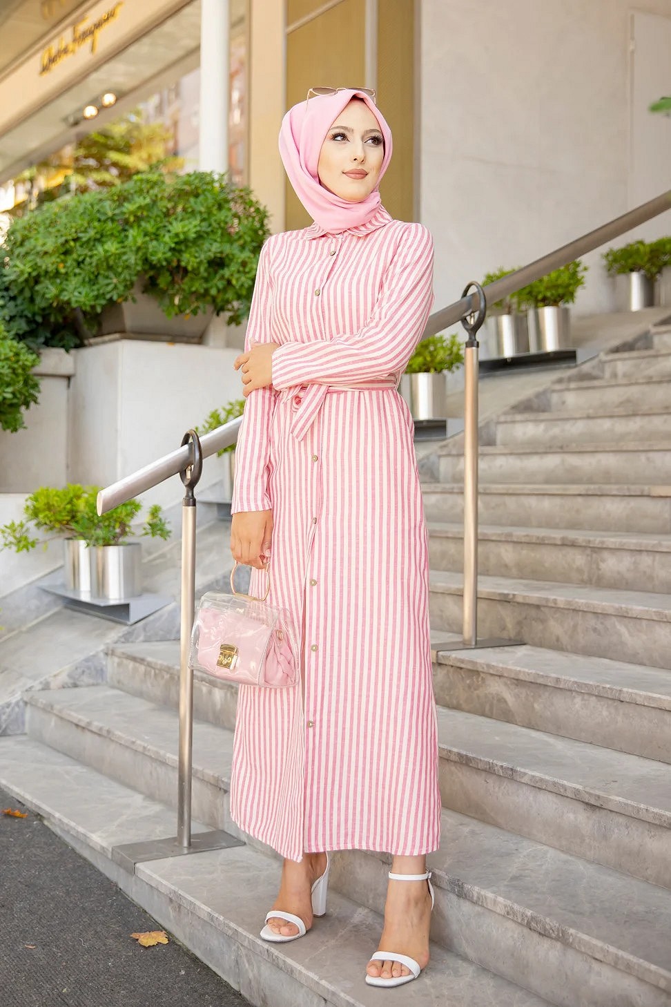 Robe longue casual boutonnée avec sa ceinture (Vetement chic pour femme voilée) - Couleur Rose