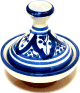Mini tajine marocain décoratif en poterie de couleur blanc émaillé avec motifs bleus peints
