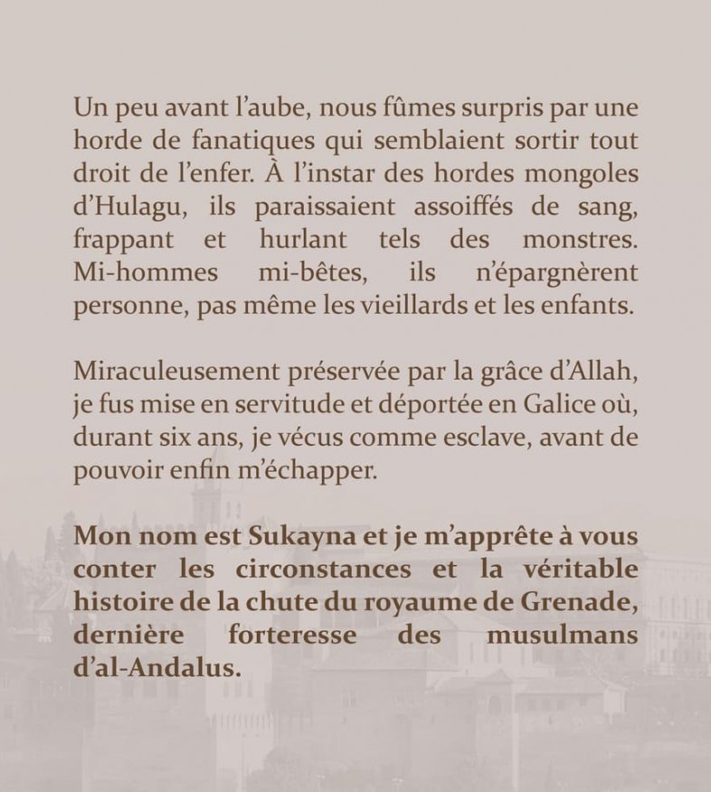 Mon nom est Sukayna et je m'apprête à vous conter les circonstances et la véritable histoire de la chute du royaume de Grenade, dernière forteresse des musulmans d'al-Andalus.