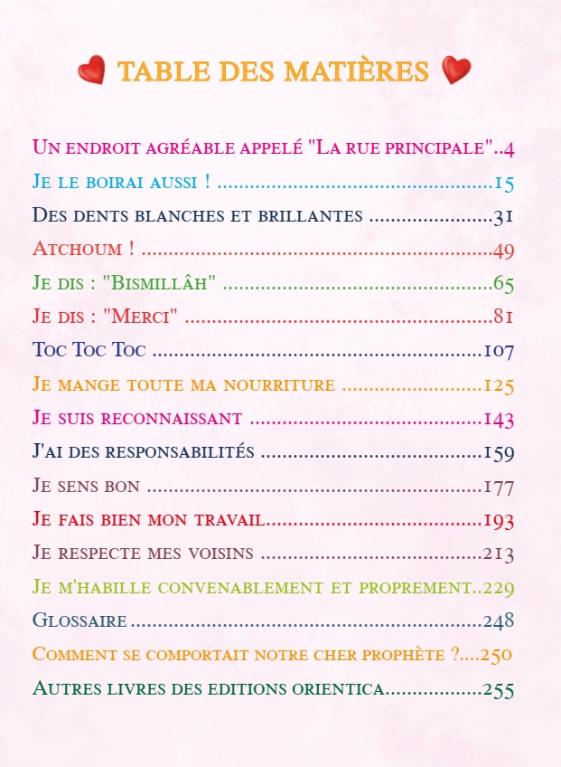 Chaque chapitre du livre repose sur un enseignement prophétique, qui met en scène le comportement exemplaire du Prophète Mohamed ﷺ, étayé par un hadith dont la référence est précisée en note de bas de page. Chaque chapitre est aussi suivi d’activités interactives et de travaux manuels qui ancrent ces leçons précieuses dans la vie quotidienne de nos enfants.