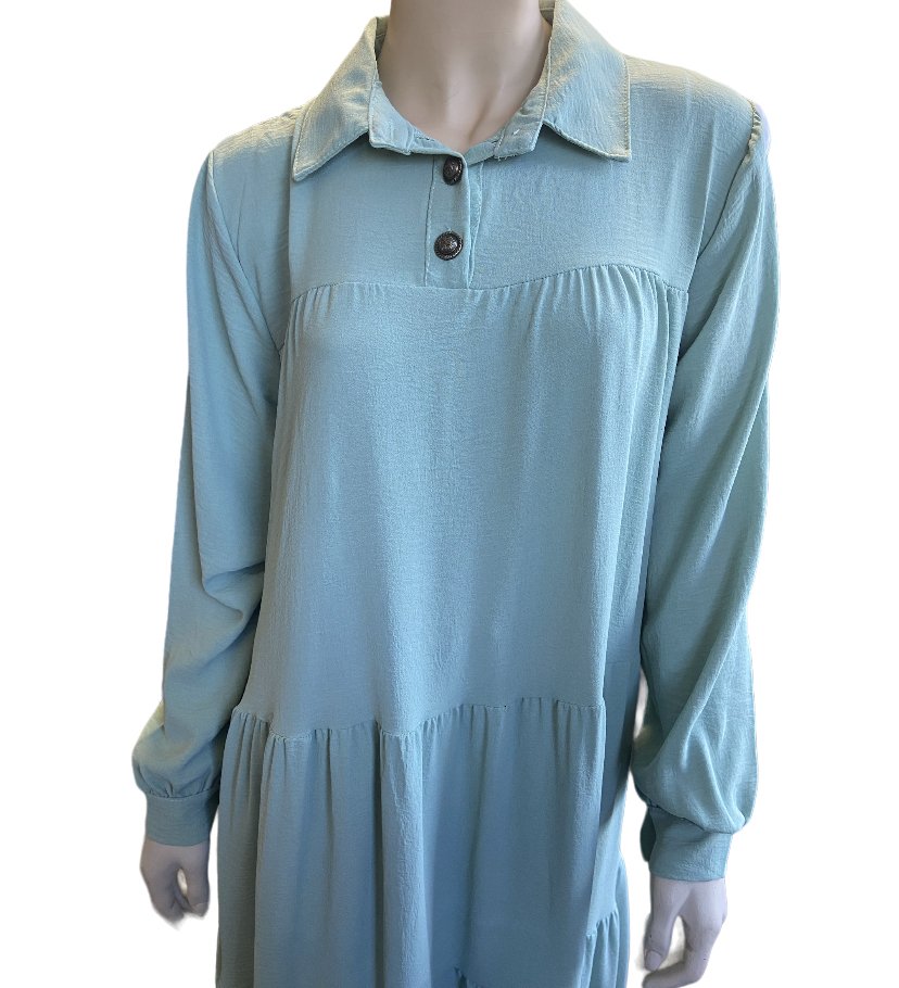 Robe longue et évasée en tissu fluide, avec des boutons au col et aux manches.