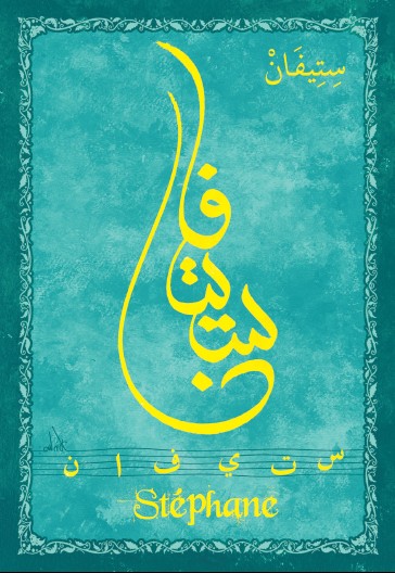 Jolie carte postale représentant le prénom français Stéphane calligraphié en arabe ainsi que son épellation lettre par lettre en arabe. Derrière la carte postale se trouve la signification du prénom. Prénom d'origine grec signifiant couronne.