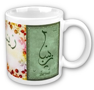 Mug avec le prénom Zaynab calligraphié en arabe (زينب) ainsi que son épellation lettre par lettre en arabe.