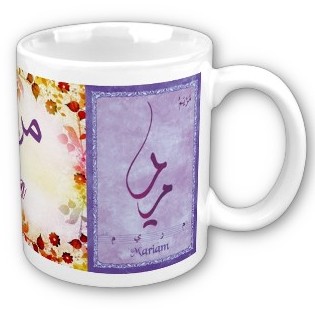 Mug avec le prénom Mariam calligraphié en arabe (مريم) ainsi que son épellation lettre par lettre en arabe.