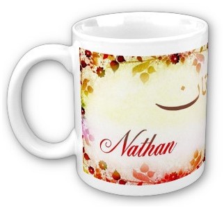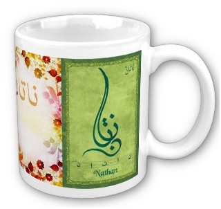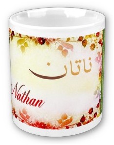Mug avec le prénom "Nathan" calligraphié en arabe (ناتان) ainsi que son épellation lettre par lettre en arabe.