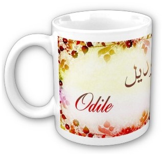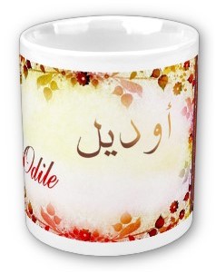 Mug avec le prénom "Odile" calligraphié en arabe (اوديل) ainsi que son épellation lettre par lettre en arabe.