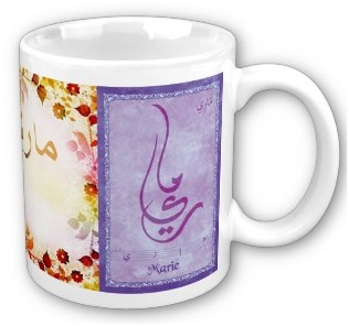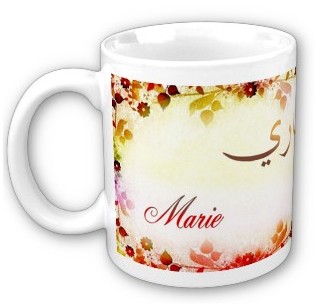 Mug avec le prénom "Marie" calligraphié en arabe (ماري) ainsi que son épellation lettre par lettre en arabe.