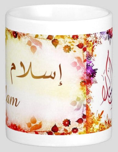 Mug avec le prénom "Islam" écrit en français, en arabe (إسلام) et calligraphié de façon artistique en arabe sur la partie droite.
