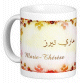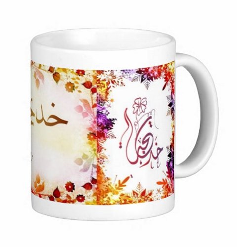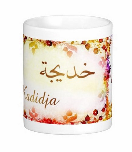 Mug avec le prénom "Kadidja" écrit en français, en arabe (خديجة) et calligraphié de façon artistique en arabe sur la partie droite.