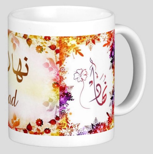 Mug avec le prénom "Nouhad" écrit en français, en arabe (نهاد) et calligraphié de façon artistique en arabe sur la partie droite.