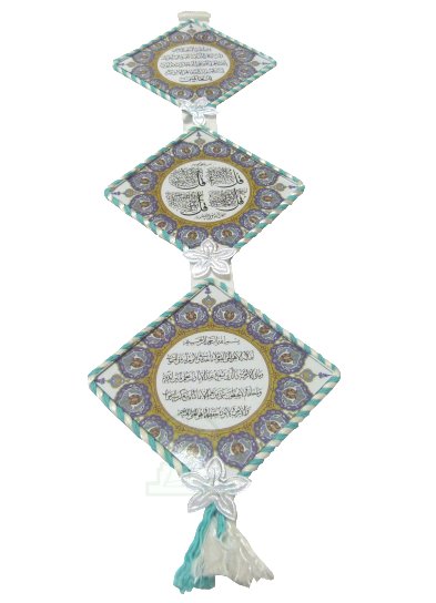 Élément décoratif artisanal, constitué de trois cadres en forme de losange en verre suspendus et garnis de tissus en fleurs et de Sabra bleu et blanc ; chaque tableau porte des versets coraniques (verset du Trône...) et des sourates (les quatre sourates Qul) calligraphiés.
