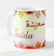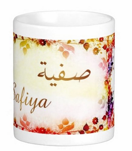 Mug avec le prénom "Safiya" écrit en français, en arabe (صفية) et calligraphié de façon artistique en arabe sur la partie droite.