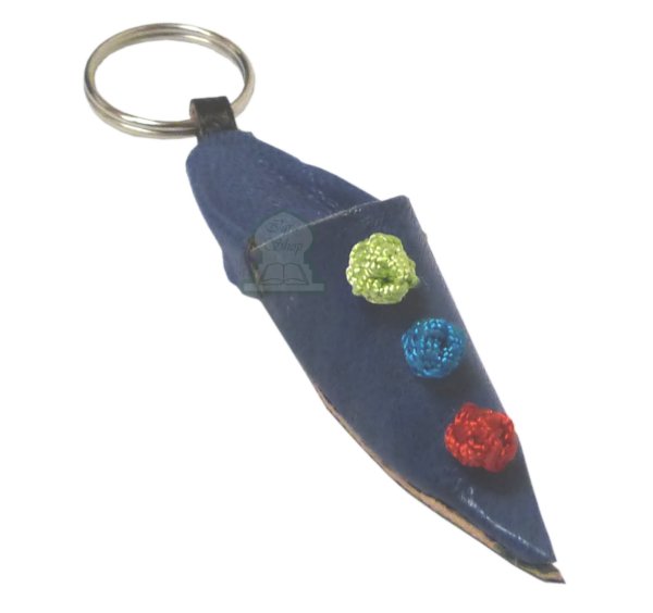 porte-clés en forme de petite babouche traditionnelle marocaine en cuir, de couleur bleue, décorée de noeuds colorés...
