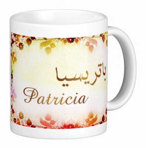 Mug avec le prénom "Patricia" écrit en français, en arabe (باتريسيا) et calligraphié de façon artistique en arabe sur la partie droite.