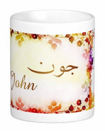 Mug avec le prénom "John" écrit en français, en arabe (جون) et calligraphié de façon artistique en arabe sur la partie droite.