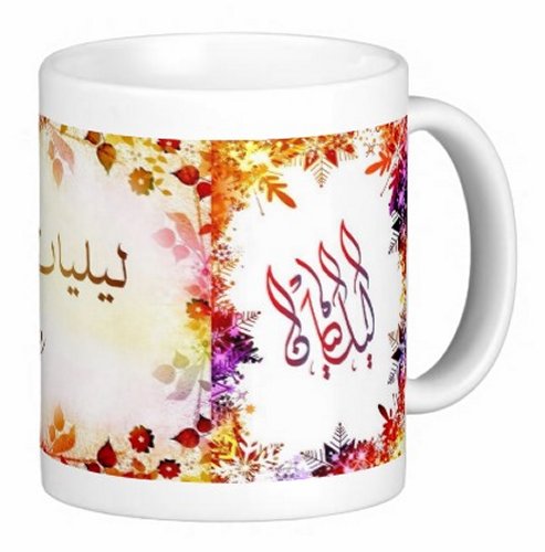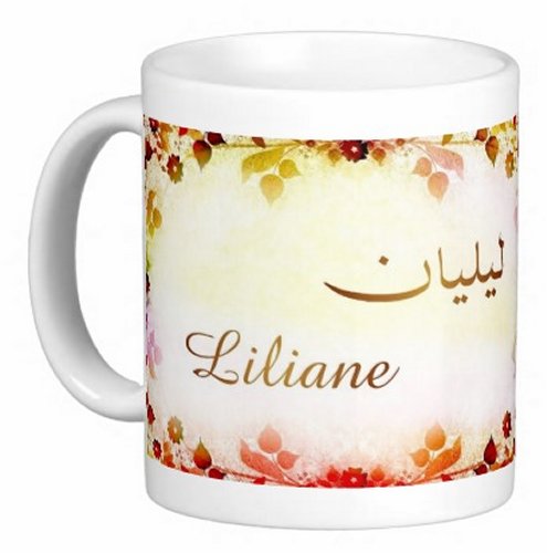 Mug avec le prénom "Liliane" écrit en français, en arabe (ليليان) et calligraphié de façon artistique en arabe sur la partie droite.