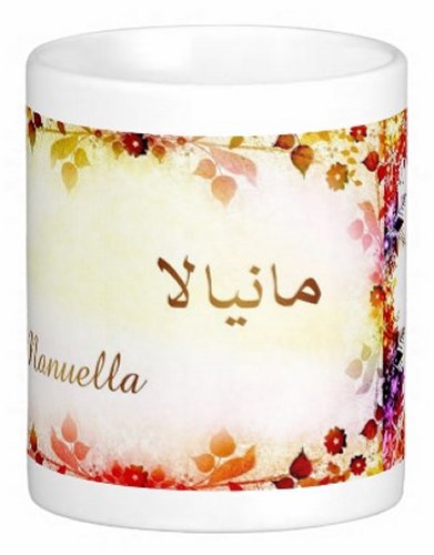 Mug avec le prénom "Manuella" écrit en français, en arabe (مانويلا) et calligraphié de façon artistique en arabe sur la partie droite.