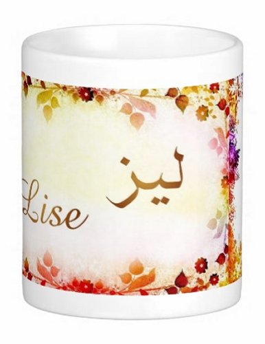 Mug avec le prénom "Lise" écrit en français, en arabe (ليز) et calligraphié de façon artistique en arabe sur la partie droite.