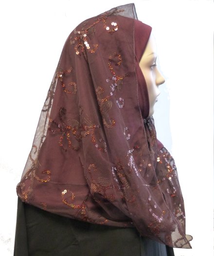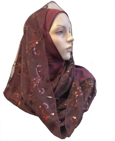 Foulard hijab 1 pièce une partie matière élastique de couleur bordeaux et une partie légère à positionner par dessus en dentelles à motifs fleuris et strass.