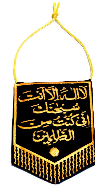 Pendentif recouvert de velours noir avec écritures dorées, sur une face l'invocation du voyage et sur l'autre l'invocation du prophète Jonas quand il était dans la ventre de la baleine : "La Illâha illâ anta Subhânaka, Innî Kountou mina-l-Dhâlimîne" (verset coranique).