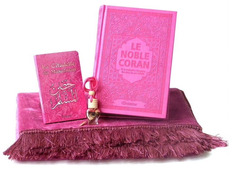 Coffret/Pack cadeau prière pour femme : Tapis rose, Coran luxe rose, Porte Coran, Diffuseur de parfums, parfum Musc d'Or et chapelet perles - REF. 21951 (45.00 €) |