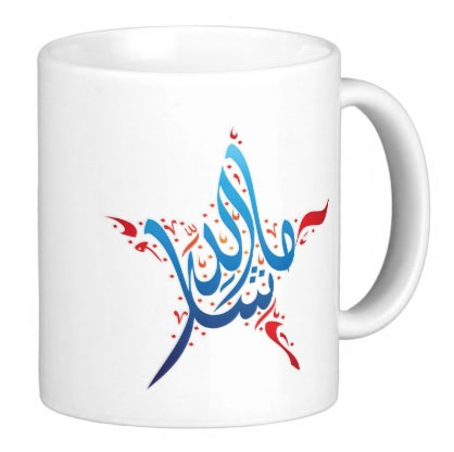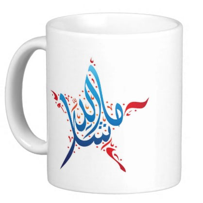 Mug avec la formule "Ma sha'a l-Lâh" (ما شاء الله) qui signifie en arabe : "Ce que Allâh veut, a lieu"... calligraphiée artistiquement en arabe sous forme d'une étoile.