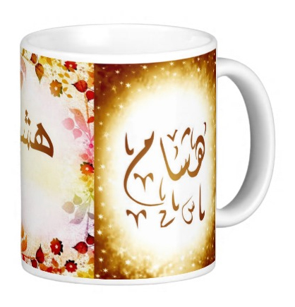 Mug avec le prénom "Hichem" écrit en français, en arabe (هشام) et calligraphié de façon artistique en arabe sur la partie droite.