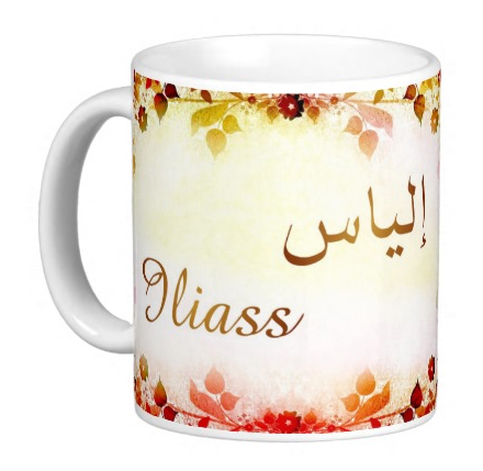 Mug avec le prénom "Iliass" écrit en français, en arabe (إلياس) et calligraphié de façon artistique en arabe sur la partie droite.