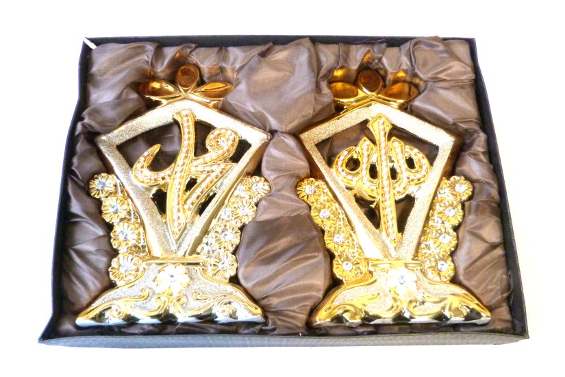Ensemble de 2 pièces décoratives dorées avec inscription Allah et Mohammed décorées de diamants et rubis blancs - REF. 23427 (29.00 €) - En Promotion à 24.90 €