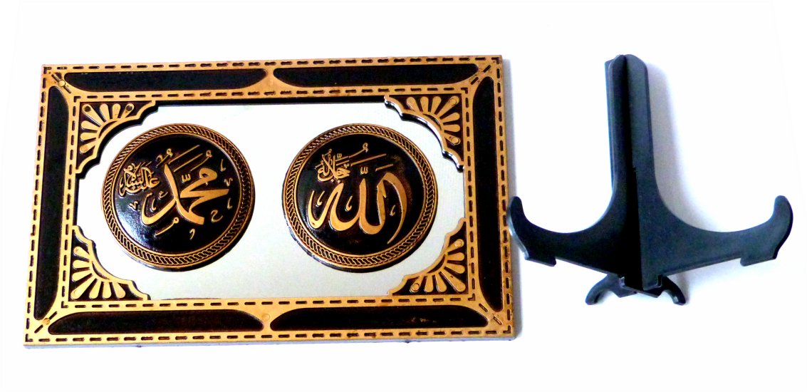 Tableau islamique en bois avec fond miroir et calligraphies du Nom d'Allah et du Prophète Mohammed (PBDSL). Fourni avec son support.