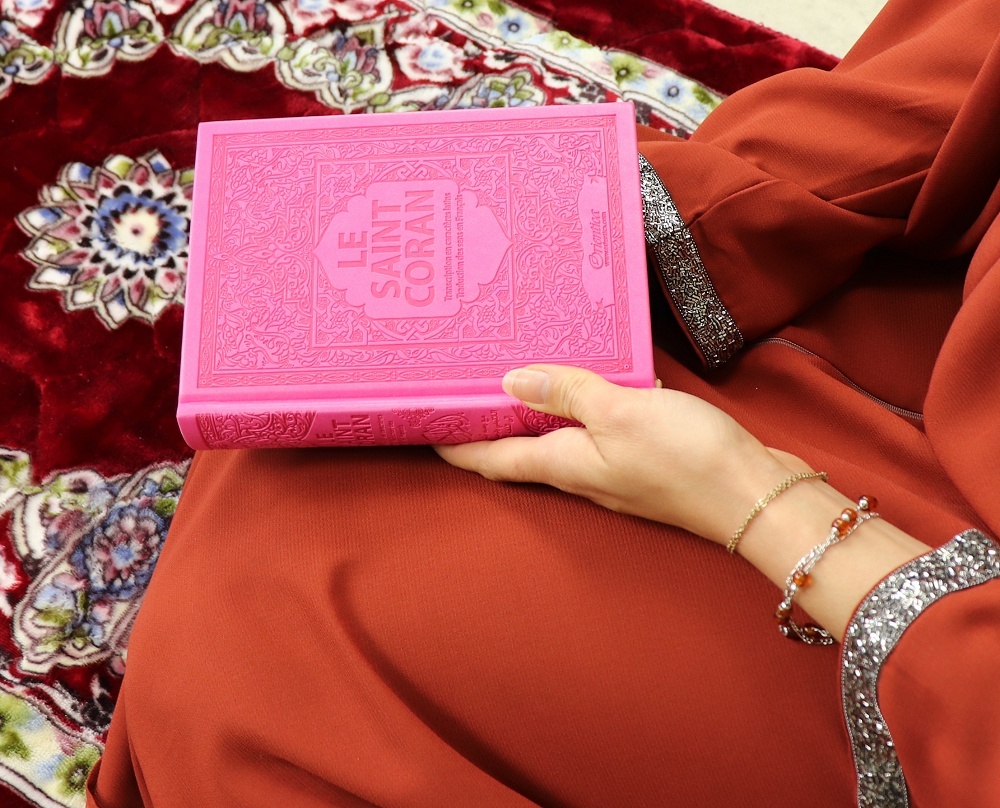 Le Saint Coran en langue arabe + Transcription phonétique et Traduction des sens en français - Edition de luxe - Couverture en cuir rose clair doré - REF. 36187 (26.90 €)