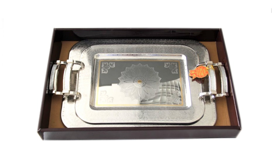 Deux plateaux en inox argentés magnifiquement décorés avec parties dorées. Les poignets sont décorés de strass.
