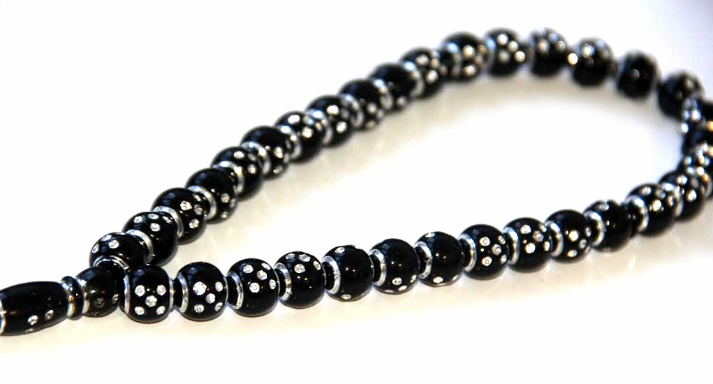 Très joli chapelet de luxe noir avec motifs argentés.