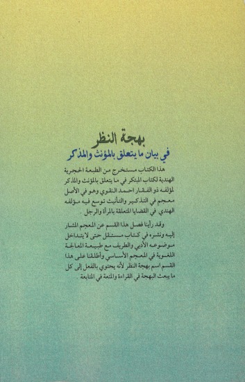 هذا الكتاب مستخرج من الطبعة الحجرية الهندية لكتاب المبتكر فيما يتعلق بالمؤنث والمذكر وهو في الأصل معجم في التذكير والتأنيث توسع فيه مؤلفه الهندي ذو الفقار النقوي في القضايا المتعلقة بالمرأة والرجل.rnوقد رأينا فصل هذا القسم عن المعجم المشار إليه ونشره في كتاب مستقل حتى لا يتداخل موضوعه الأدبي والطريف مع طبيعة المعالجة اللغوية في المعجم الأساسي وأطلقنا على هذا القسم اسم بهجة النظر لأنه يحتوي بالفعل إلى كل ما يبعث البهجة في القراءة والمتعة في المتابعة