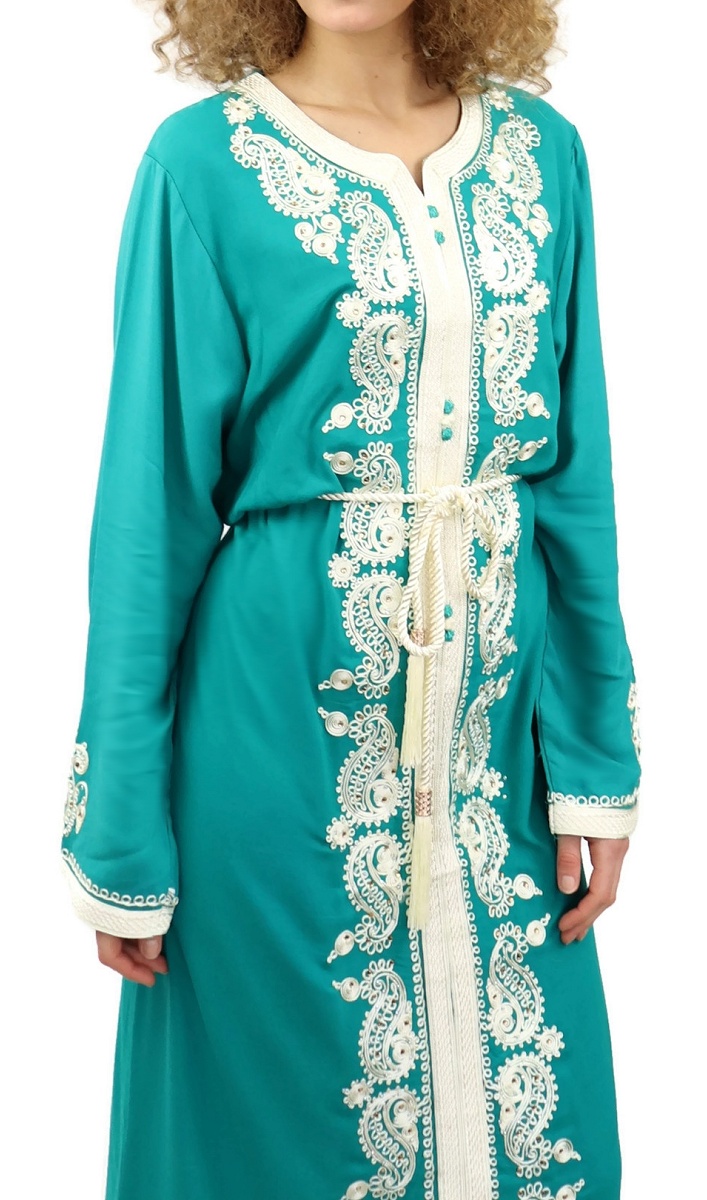 Très belle robe marocaine réalisée dans un tissu épais (non transparent), fluide et doux au toucher (coton), est fournie avec une ceinture. Le double avantage de ce modèle est d'être confortable et élégant à la fois.