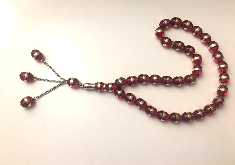 Beau chapelet rouge avec des bandes dorées. Il contient 33 grains plus quelques-uns en extrémité qui servent de décoration.