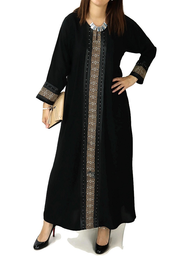 Abaya noire agrémentée de broderies marron et beige pailletées et de strass argentés sur toute la longueur ainsi que sur les extrémités des manches. Echarpe noire assortie.