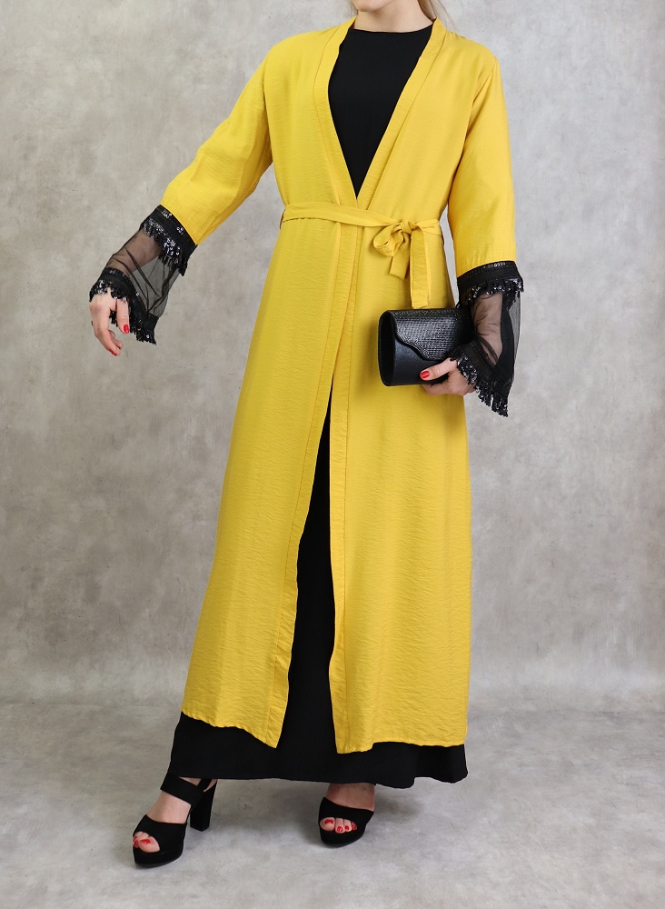 Kimono avec décorations tulle et strass de couleur jaune Vetement & Accessoire