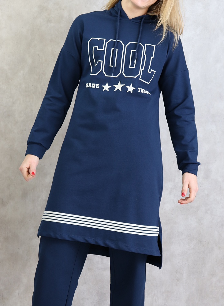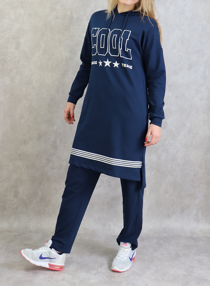 Survetement femme 2 pieces a capuche "COOL" de couleur bleu marine