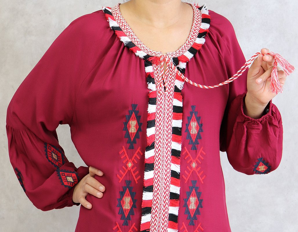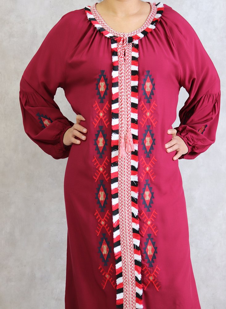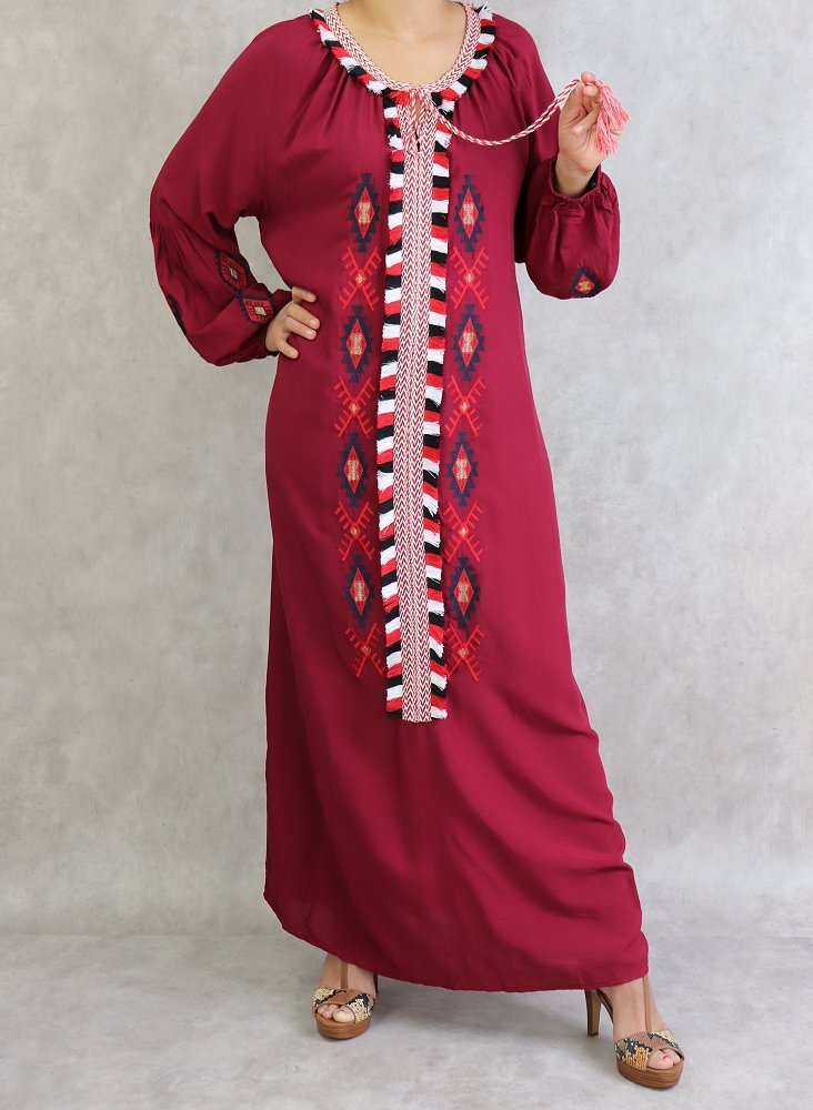 Robe longue avec motifs dorés broderies et pompons pour femme - Couleur bordeaux - REF. 33587 (29.00 €)