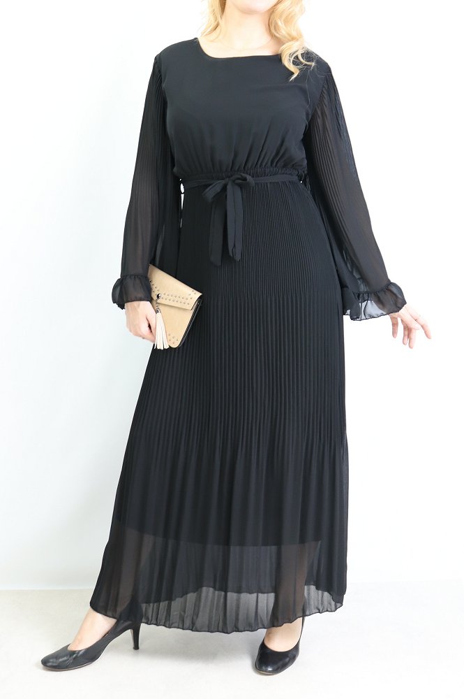 Robe longue ajustable à la taille. Plissée en bas de la robe ainsi que sur les manches évasées, le tout accompagné d'une ceinture qui peut se mettre autour ou par derrière. Intérieur doublé. Tissu de type mousseline.