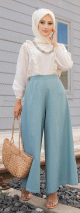 Ensemble Pantalon ample type Palazzo et Blouse avec collier assorti (Tenue Hijab casual pour femme voilée) - Couleur crème et vert amande - REF. 32872 (19.90 €)