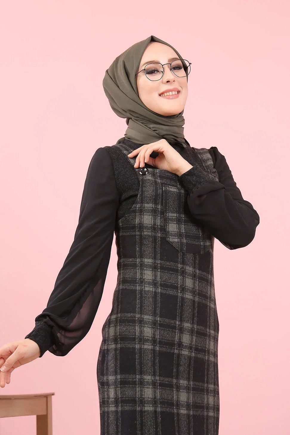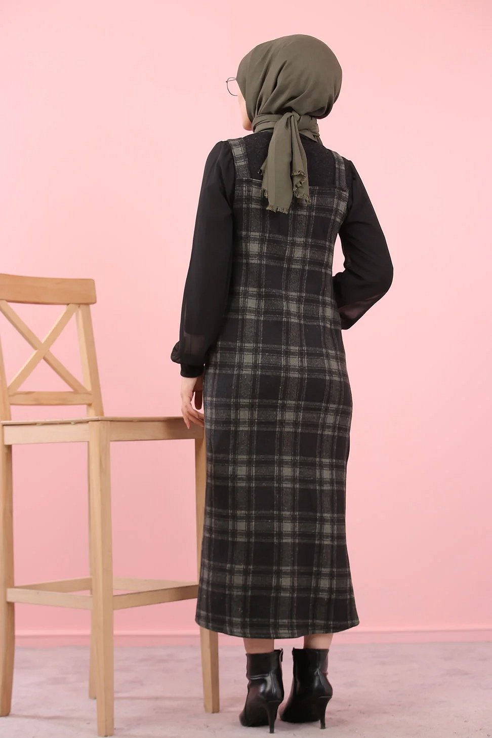 Robe Salopette femme a carreaux de couleur noire et kaki (Tenue Hijab et Modest Fashion)