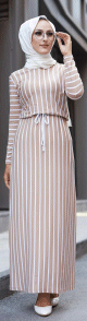 Robe longue à rayures ceinture intégrée (Vetement femme voilée) - Couleur Beige - REF. 33884 (19.90 €)