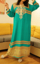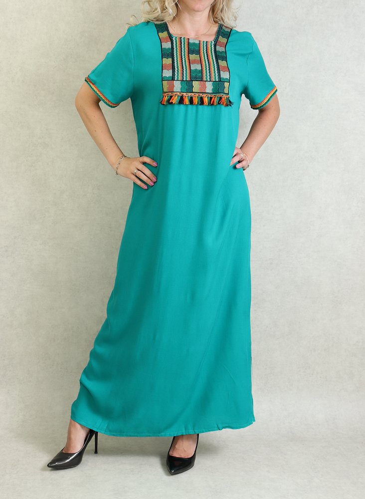Robe longue manches courtes pour femme avec broderies originales, coupe droite, tissu fluide et doux au toucher coton.
