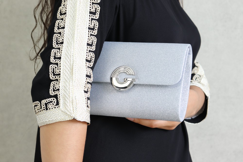 Pochette et Sac bandoulière pailleté. Rabat fermé par pression magnétique avec logo sous forme de G en métal. Une fine bandoulière en métal amovible complète ce modèle et permet de la porter aussi en bandoulière. Une petite poche de service permet de ranger vos clés ou de petits objets.