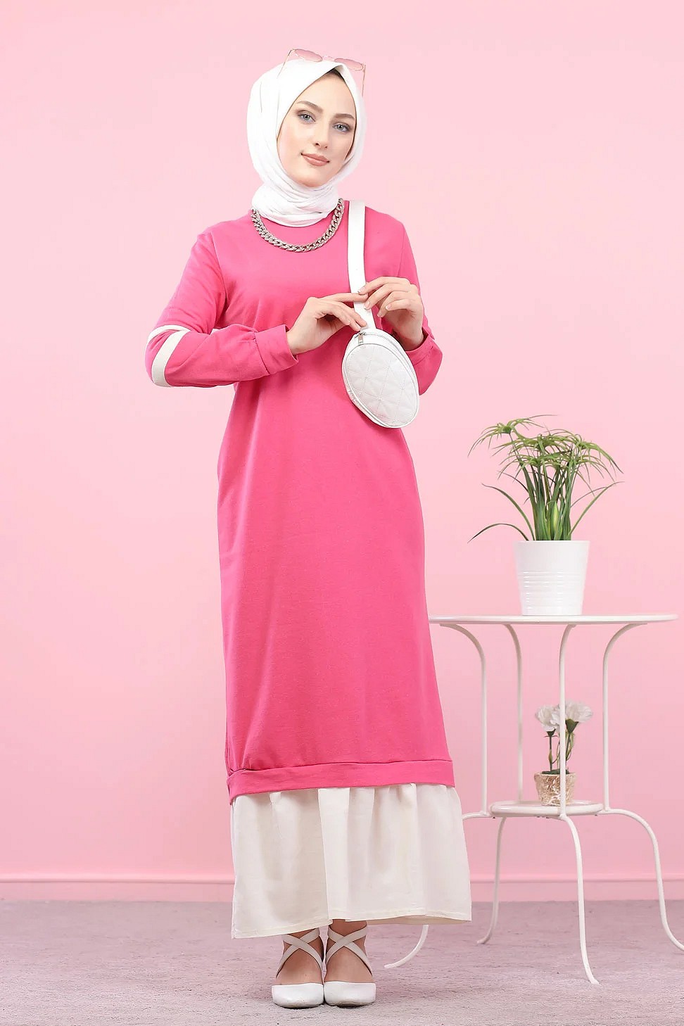 Robe longue moderne et decontractee bi-couleur pour femme voilee (Robes Hijab pas cher) - Couleur rose fuchsia et blanc